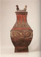 鈁為敞口鼓腹,方形圈足,有蓋,蓋頂四角飾。通體以紅、白色彩繪出鋸齒紋、云氣紋。鈁即方形壺,用以盛裝酒漿或糧食,盛行於戰(zhàn)國末西漢初。陶鈁是仿銅禮器,西漢時期的墓葬中,多和陶鼎,陶敦等器成組出現(xiàn)。