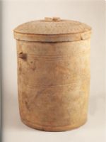 器身圓筒狀,子口合蓋,蓋有雙片鈕,蓋面飾篦紋和弦紋四道。矮圈足,圈足有對(duì)稱的雙孔,以穿繩帶。腹部有弦紋一道,兩側(cè)有耳,筒內(nèi)壁朱書隸體[九真府]三字。[九真]迺漢代郡名,可見此器物與九真郡有密切的聯(lián)系,對(duì)準(zhǔn)確判明墓主人的身份有著重要的參考價(jià)值。
