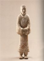 俑呈立姿,發(fā)分兩顳,腦后挽髻,身著兩重衣,均交襟右袵,外衣色白,領(lǐng)、袖、下襬均露出紅色內(nèi)衣,足蹬方口齊頭履。雙手拱於腹際,拳眼上下相對,原應(yīng)持有儀仗之類,已佚。