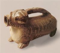 口部飾有虎首,軀體作圓筒狀,背有扁平提梁。四肢向前屈曲作臥伏狀。腹部和四肢刻劃條紋來表現(xiàn)虎斑。釉為醬黃色,剝落嚴(yán)重,剝落處露紅胎,胎質(zhì)疏鬆。此器形態(tài)生動有趣,造型樸拙。陶瓷虎子在我國使用范圍很文,年代久遠(yuǎn),式樣頗多,此迺最早的一種。