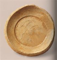 瓷片的內(nèi)底中心刻劃一只朱雀,周圍劃水波紋。朱雀頭頸高昂,雙翅舒展飛翔在江湖上空,紋樣新穎。