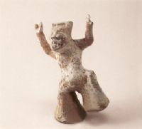 俑戴冠,裸上體,雙手開(kāi)掌上舉,下穿寬?cǎi)绽妊,右腳著地,左腿曲膝抬起,似作拍手踏足的舞姿。通身施白彩。該俑雖然面部混沌,手不分指,但其彪悍的身軀,突出的雙乳和耐人尋味的面部表情,形象地給人以詼諧、風(fēng)趣的啟迪。