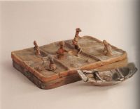 水田分為六方,五方田面刻水波紋,一方田面為篦點(diǎn)紋,每方有一俑在勞動。第一方俑戴斗笠,雙手作扶犁狀,犁頭略呈心臟形;第二方俑執(zhí)鐮作收割狀;第三方一俑坐田埂上作磨鐮狀,田裹有兩禾堆;第四方一俑作扶犁狀,田面有一犁頭,旁有兩圓堆;第五方一俑作俑企立,田面篦點(diǎn)紋表示插過的秧苗;第六方附兩禾堆,有一俑似在綑稻草。