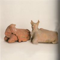 細(xì)泥紅陶,質(zhì)堅(jiān)光滑。左:母牛呈側(cè)臥狀,面對(duì)初生牛犢,并用舌頭在舐吻小牛嘴臉,形態(tài)逼真生動(dòng),愛(ài)子之情,栩栩如生。右:公牛,四足跪臥,仰首正視,豎角豎耳,神態(tài)閑靜,嘴略張,似作休息反縐狀。這兩件陶牛是廣東漢代陶牛泥塑中的精品。