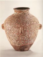 以黑色器表為底,用紅、白兩色彩繪,肩以上繪兩組獸面紋,器表繪滿其他紋飾。紅、白彩與黑底形成三色的圖案效果。