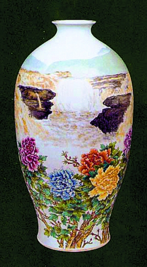 首度亮相的禮品瓷《源》、《脈》也有著很高的藝術(shù)品質(zhì)!对础芬渣S河標(biāo)志性景觀壺口瀑布做遠(yuǎn)景,以牡丹花團(tuán)錦簇為近景;《脈》以萬里長城做遠(yuǎn)景,以牡丹花團(tuán)錦簇為近景。兩個(gè)作品寓意著兩岸同胞都是炎黃子孫,血濃于水,同宗同源。