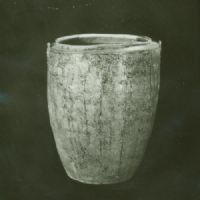 束口、無頸、折肩、直筒形腹,平底,器面修整不平、內(nèi)外施釉不勻。下沿至上腹對稱二繩索。上腹拍印重線水波紋和云雷紋。