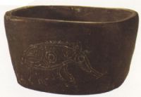 泥質(zhì)夾炭黑陶。敞口,深腹,腹呈長(zhǎng)橢圓形,平底。器外兩側(cè)刻劃豬紋。此器造型古樸,色澤純黑,豬紋刻劃較精美,筆法簡(jiǎn)練,線條粗獷,神態(tài)逼真,豬身上裝飾有圓圈和葉紋。