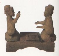 泥質(zhì)灰陶。兩人對(duì)坐於長(zhǎng)方形臺(tái)座上正在博戲。一人雙手前伸,手心向上,另一人雙手斜上舉,掌心相對(duì)。兩人中間置放一方形盤(pán),盤(pán)半邊放長(zhǎng)條形箸六枚,半邊放一小方盤(pán),即博局,在博局兩端各有六枚方形棋子。通體施綠釉。博戲是漢代盛行的一種娛樂(lè)活動(dòng),現(xiàn)已失傳。此器造型生動(dòng),人物形象逼真,具有時(shí)代特徵。