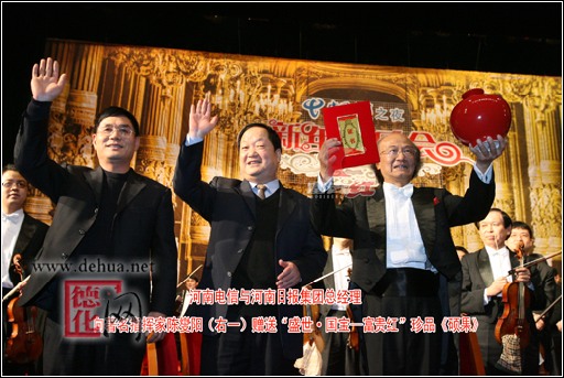 年近古稀的指揮家陳?ài)脐?yáng)激情四溢,手中的指揮棒著了魔似的靈動(dòng)有力。音樂(lè)會(huì)一開(kāi)場(chǎng)就奏起歡快喜慶的旋律,歌劇《魯斯蘭與柳德米拉》充滿明朗的色調(diào)很快把聽(tīng)眾帶進(jìn)交響樂(lè)的迷人世界。輕快的《乘風(fēng)破浪圓舞曲》、柴可夫斯基的《波羅涅茲舞曲》、熱鬧的《波斯的集市》、歡樂(lè)的《假日的小號(hào)手》,流暢優(yōu)美的旋律隨著他的指揮棒,從管弦樂(lè)隊(duì)的樂(lè)器中如水般流瀉出來(lái)。芭蕾舞劇《紅色娘子軍》選段熟悉的旋律一出,聽(tīng)眾頓感精神振奮,那些青春的回響,那些難忘的記憶,令人心潮澎湃。還有民族管弦樂(lè)《茉莉花》、方可杰的《大起板》、京胡交響樂(lè)《普天樂(lè)》,一曲曲聽(tīng)來(lái)都是那么親切,那么有韻味兒。不少觀眾感慨:今年的音樂(lè)會(huì)增加了民族音樂(lè)的成分,聽(tīng)起來(lái)特別得勁兒。演出結(jié)束后,河南日?qǐng)?bào)報(bào)業(yè)集團(tuán)和河南省電信公司領(lǐng)導(dǎo)把一個(gè)大紅色的“富貴紅”瓷瓶贈(zèng)送給陳?ài)脐?yáng)。瓷瓶由河南富貴紅貿(mào)易有限公司(福建德化)友情提供,象征吉祥平安。