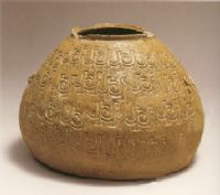 小斂口,低領(lǐng),腹斜直略鼓,大平底。通體滿飾密集的蟠螭紋組成并列的橫帶條。造型別致,器表裝飾華麗。呈現(xiàn)出較高的制作工藝水平。