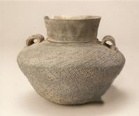 直口,高領(lǐng),圓折肩,深腹小平底,肩部有兩個對稱雙拱狀耳。頸部飾三角線紋,肩與腹表滿撲小方格紋或云雷紋。