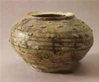 斂口、寬沿、束頸、溜肩、鼓腹,腹以下收斂、平底。胎質(zhì)灰、硬,施青黃色釉。肩部兩側(cè)有一對稱耳系,耳系兩側(cè)均堆塑一S紋,肩腹部飾弦紋、錐刺紋和五道堆塑勻稱的S紋。