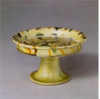 盤撇口,豐底,高足。中空外撇,足上刻弦紋兩道,釉開碎紋,盤心凹凸不平。這件唐三彩高足盤器形完整,盤心印有圖案式朵花紋樣,活潑明快,這在三彩器中極為少見。此器色彩班駁,釉面流動瑰麗,充分體現(xiàn)了三彩釉陶的藝術(shù)特色。