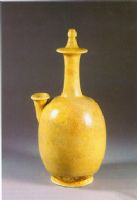 唇口,細(xì)長(zhǎng)頸,頸部有一盤(pán)狀凸棱。肩部有一唇口管狀流。溜肩,腹部呈長(zhǎng)圓形,底足外撇,胎質(zhì)灰白,滿(mǎn)施白色化妝土。釉白閃米黃色,開(kāi)細(xì)小冰裂紋,施釉不及底,造型似仿唐代金銀器。