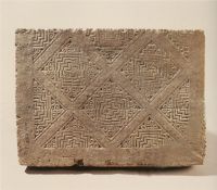 泥質灰陶。磚面近長方形,磚面上印制菱形幾何圖案紋飾.