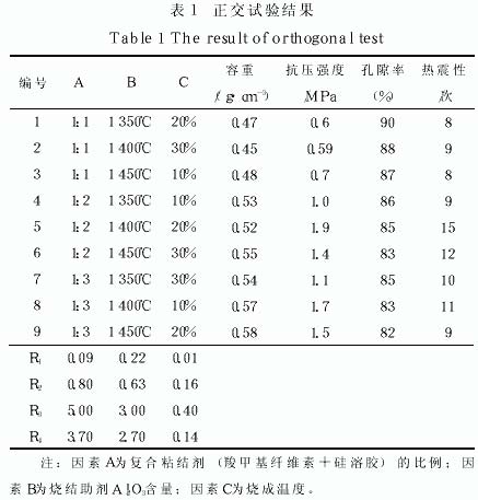 為了確定復(fù)合粘結(jié)劑的比例、燒結(jié)助劑的加入量、燒成溫度及獲得良好的漿料性能, 本次試驗采用的原材料是: 純度大于95%的SIC微粉 (320目)作為基料,純度大于97%的工業(yè)α-AI2O3細(xì)粉 (320目) 作為燒結(jié)助劑, SIO2濃度為50%的硅溶膠和CMC作為復(fù)合粘結(jié)劑。采用有機(jī)泡沫浸漬法制備出碳化硅質(zhì)泡沫陶瓷過濾器,其燒結(jié)過程由烘干、揮發(fā)、高溫焙燒等組成。I(9 33)正交試驗的三因素分別為復(fù)合粘結(jié)劑 (羧甲基纖維素+硅溶膠) 的比例 (質(zhì)量比) 、燒結(jié)助劑AI2O3含量 (質(zhì)量分?jǐn)?shù), 下同) 及燒成溫度 (℃) 。