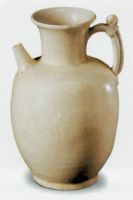 侈口長頸,短流,三股曲柄,肩部豐滿,腹高而直,圈足。該壺器形渾圓飽滿,胎質(zhì)致密,除足部外均施白釉,釉子均勻純凈,潔白光潤,為白瓷之佳品.