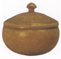 口微斂,圓鼓腹,平底。蓋面隆起,飾弦紋,蘑菇狀鈕。通體施青釉,釉較薄,玻璃質(zhì)感強(qiáng),有細(xì)碎開片,米黃色胎。此鉢造型樸實(shí)端莊,器型頗完整。但胎釉結(jié)合不緊密,有脫釉現(xiàn)象,且無紋飾。