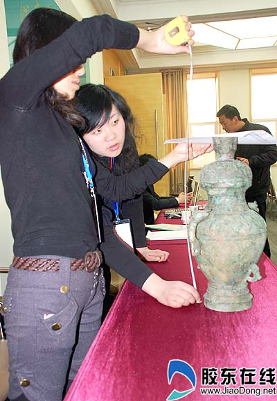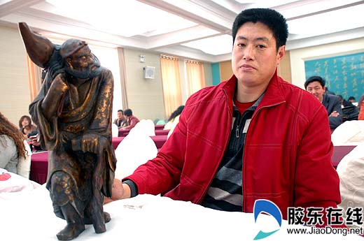 家住牟平區(qū)的衛(wèi)先生是一名收藏愛好者,他告訴記者,自己這次帶來了一尊木制鑲金“鐵拐李”,請北京來的專家給鑒定一下。衛(wèi)先生的這件寶貝是“八仙過海”中的一個,是祖上留下來的,請好些人鑒定過,都說是真的。得知此次來煙臺的專家曾在CCTV-2《鑒寶》節(jié)目擔(dān)任過專家評委,就決定花200塊錢報名再來看看。一位不愿意透露姓名的市民帶來了一件青銅器,專家現(xiàn)場鑒定之后,給出的估價是12萬元人民幣。這位市民喜出望外,隨即花了1500元,為他的這件寶貝辦理了鑒寶證書。
