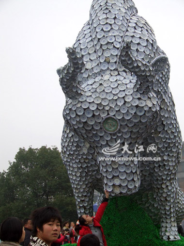 元宵佳節(jié)即將來臨,在景德鎮(zhèn)人民廣場,一只由該市有關(guān)部門于日前制作的大瓷牛,引起了中外游人的注意,大家爭先恐后地搶著與大瓷牛合影留念。據(jù)悉,這只大瓷牛是用上萬塊青花瓷盤搭制而成,被譽為目前世界上最大的青花瓷牛。