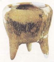 夾砂紅陶。斂口,筒形腹,平底,錐狀足。腹與足飾粗繩紋,近口沿處等距離貼塑四個鼓釘紋。