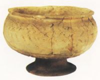 唇口,扁圓腹,喇叭足。胎體堅硬厚重。腹飾錐刺紋,細(xì)方格紋,類似“米"字紋的三重複合紋樣。