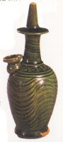 小口,長(zhǎng)頸,圓肩,長(zhǎng)腹下收,圈足,胎呈黃色。腹飾篦劃波浪紋,施綠釉。此浮瓶造型端莊,裝飾技法集堆塑、劃花、模印於一身,紋飾清晰,綠釉鮮亮,胎質(zhì)細(xì)膩。