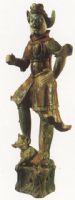 頭戴盔,面目猙獰,唇留短鬚。圍項護(hù),身穿鎧甲,左手叉腰右手高舉,足穿長靴,右足下踩一小鬼,小鬼作掙扎狀。其下是墩形圓臺。面部輿手部為朱紅彩,鎧甲描金。
