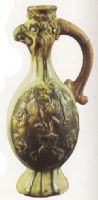 胎呈白色。橢圓形口,口下部作鳳頭狀,細(xì)頸,橢圓形扁腹,平底,頸腹間安有環(huán)形把柄。腹部兩側(cè)以綠釉為地,浮雕三彩圖案,一側(cè)為立鳳紋,另一側(cè)為騎馬狩獵紋。通體施黃、綠等三彩色釉。