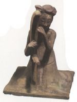 泥質(zhì)灰陶。頭梳平髻,腦後插梳,外罩長裙垂地,跪坐於地。面帶微笑,神態(tài)恭順,懷抱箜筱,雙手撥弦。施以紅、綠兩彩裝飾。
