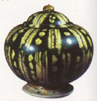 胎呈白色,斂口,豐肩,鼓腹,矮圈足。配圓形蓋,上有寶珠形鈕。器身施綠釉為地,上飾黃褐色的圓點(diǎn)和寬帶紋。