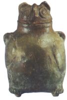 蓋為鸮頸,器腹赫鸮身,鸮蹲立狀。子母口,粗頸,屑部飾雙環(huán)鈕,腹下有三乳足釘。蓋上鸮頭雙耳豎立,兩目圓睜,鉤形嘴。器施黃釉。