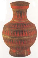 泥質(zhì)灰陶。敞口,高頸,折肩,鼓腹,圈足。帶蓋。器用紅、黃、白三色裝飾。頸、肩、腹部彩繪三角紋和白色小圓點(diǎn)裝飾。