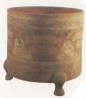 泥質(zhì)灰陶。平口,直腹,平底,三獸足。器腹部繪五位年輕女子,席地跽坐,高髻,眉清目秀,身著寬袖長衣,一人正舞袖表演,另外四人似正在伴唱,通體施紅、白、黑彩。此器造型規(guī)整,紋飾生動,所畫人物簡潔。表現(xiàn)出漢代特有的繪畫風格。