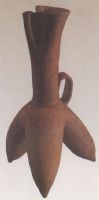 細(xì)質(zhì)紅陶。直口,圓唇,口處有管狀流,輿口相隔,細(xì)長頸,腹部高開襠,下設(shè)三長袋足。頸和袋足之間飾有帶狀橋形鋬手。