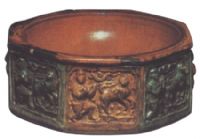 盤呈八角柱形,外壁各面印人戲獅紋,人物形象為西亞人,施黃、褐、綠釉。此器造型規(guī)整,釉彩艷麗,紋飾精美別致,立體感強,顯示出遼代三彩燒制技術的高超水平。