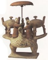 泥質(zhì)灰陶。展翅承載朱繪鼎,背部站立三人。兩個(gè)身穿紅袍,拱手而立。漢代人把鵨視作吉祥之鳥,滿鼎美食,供入食用,可以長(zhǎng)生不老。