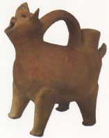 夾細(xì)砂紅陶。壺作豬形,仰首張口為流,尾根處有筒形口為注口。背部有鋬以便提攜。大汶口文化的家豬馴養(yǎng)已很發(fā)達(dá),並作為財(cái)寓的標(biāo)誌,三分之一的墓葬有豬頭或豬骨,此器作成豬形應(yīng)是這種經(jīng)濟(jì)生活的反映。
