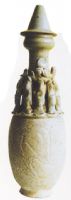 平頂圓錐形蓋,杯口,長頸,長圓腹,圈足外撇。胎色白中泛黃,體施青白釉。頸部刻劃弦敘數周,肩部做波浪紋狀平臺一周,臺上堆塑十二俑。頸中部貼塑一騰雲駕霧的飛龍,龍首昂立。腹部  周身刻劃纏枝牡丹紋,線條流暢。影青釉堆塑瓶是江西及其周圍地區(qū)特有的一種隨葬明器。
