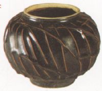直口,球腹,圈足?谘叵轮粮瓜虏匡椂臈l突起的縱向右斜扉棱,又有七條斜棱輿之相交。白胎,施黑釉。扉棱釉較薄,呈黃褐色。罐內(nèi)蕩釉,口沿和器底露胎。