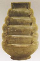 直口,鼓腹,瘦底,圈足。器身自下而上飾五道弦紋,每道弦紋貼飾四個(gè)錐形尖角;野滋,通體施青褐釉。多角瓶始於唐代晚期,流行於五代,宋時(shí)器型變小,特別是錐形角變?yōu)槿橥粻。此瓶造型奇特,製作精細(xì),惟口有殘,又缺蓋。