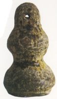 器呈葫蘆形,灰褐胎,上部有一小孔作繫繩之用,束腰,平底。通體施黃褐色釉,大部分已剝落。