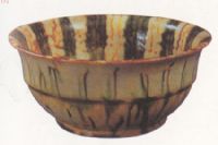白胎。敞口,弧壁,腹中部有凸棱一道,圈足。內(nèi)外壁均以米黃色釉為地,外壁施黃、綠釉細條,內(nèi)外壁施綠色寬垂條紋和褐色細條紋。此器造型優(yōu)美,釉彩鮮麗,晶瑩潤澤,形成彩色斑斕的裝飾效果,顯示出三彩花釉之美,是三彩器中之佳作。