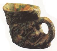 胎呈白色。象首形,杯口呈不規(guī)則狀,口沿下淺浮雕花草紋。上翹象鼻作成杯把,並飾以枝葉等紋,杯身雕出象首、象眼、象耳和象嘴等,通體施綠、黃、白和赭等三彩色釉。
