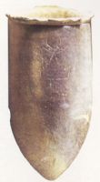 夾砂灰陶。侈沿,直口,筒形深腹,尖圜底。腹上部刻有“凸”,為圖像文字。此器為泥條盤築法手制而成,胎質(zhì)堅(jiān)硬,反映出大汶口文化較高的陶器製作和燒造水平。