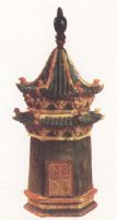 仿木結(jié)構(gòu)建築塔的形制,重薝六角攢尖頂,體施三彩釉。塔身刻有“時(shí)大安二年燒製”題記。此舍利塔形體高大,造型別致,製作精湛,施釉鮮艷,顯示出金代陶器的製作水平。