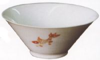 敝口,器壁斜下,內(nèi)小平底,矮圈足。碗內(nèi)底白釉上繪一倏紅角。外壁釉上等距繪四倏紅魚紋,紅白相映,鮮艷奪目。圈足內(nèi)青花楷書“大清雍正年裂"三行六字款。