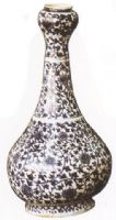 胎體厚重,修胎粗糙,接痕明類。蒜頭口,粗長頸,圓腹,寬圓矮圈足,砂底。釉色白中閃青,釉層稀薄。通體繪纏枝蓮,釉層濃重外帶有明顯的凸起的黑色斑點。
