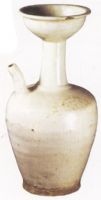 洗口,圓唇,細長頸,豐肩,肩一側附流,下腹斜收,假圈足。灰白胎,胎質較粗,施白釉,釉色灰白泛青,釉質溫潤。出土於遼代墓葬,輿之同出的有白釉花式口碗、白釉盤、盂和三彩。